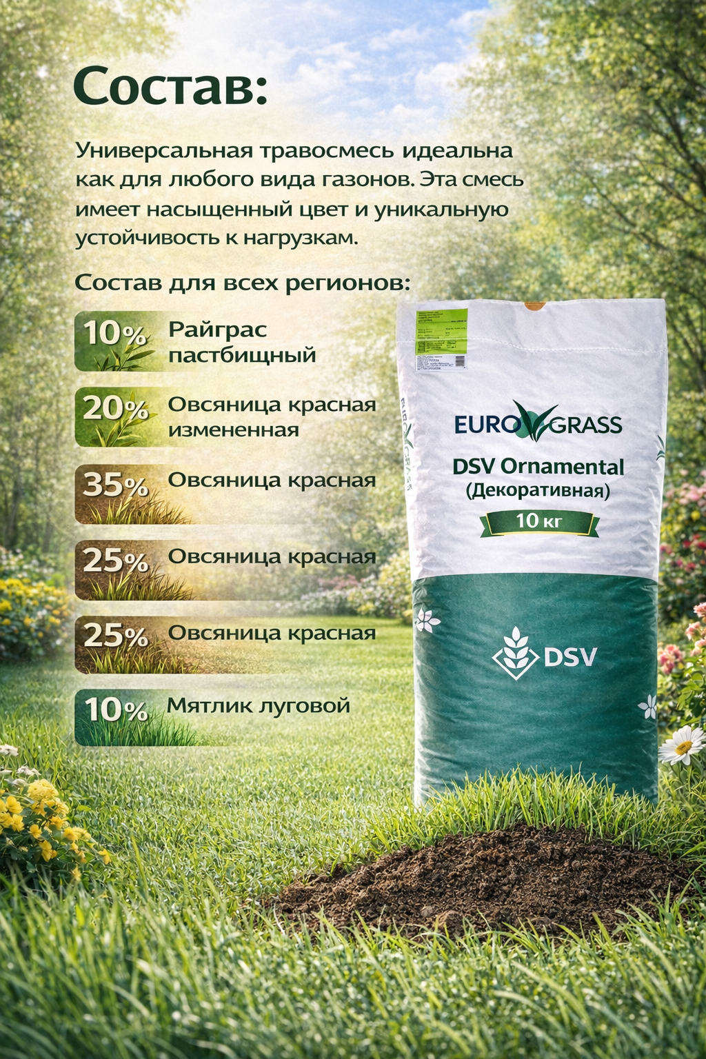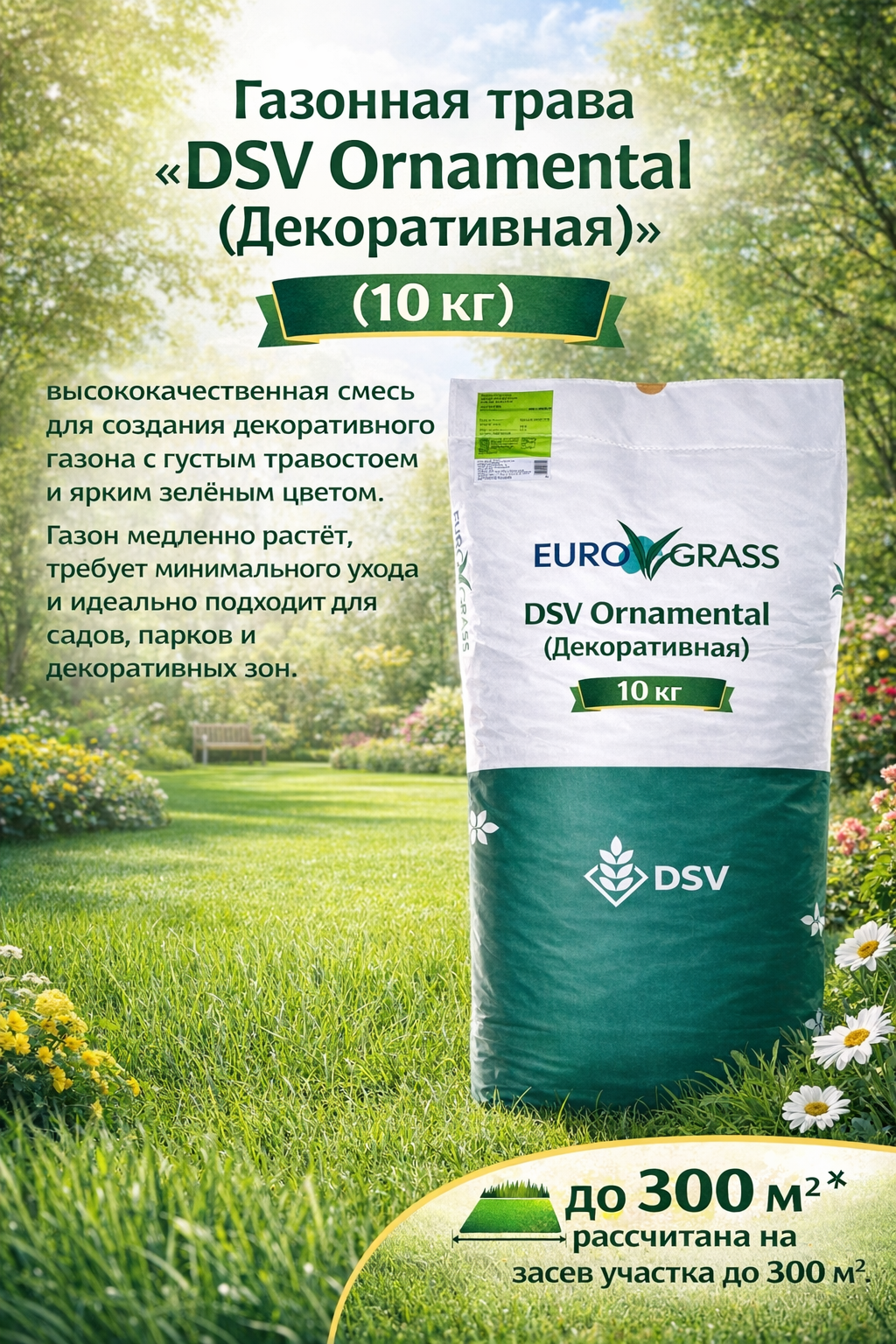 Газонная трава «DSV Ornamental (Декоративная)» (10 кг) — высококачественная смесь для создания декоративного газона с густым травостоем и ярким зелёным цветом. Газон медленно растёт, требует минимального ухода и идеально подходит для садов, парков и декоративных зон. Упаковка 10 кг рассчитана на засев участка до 300 м².