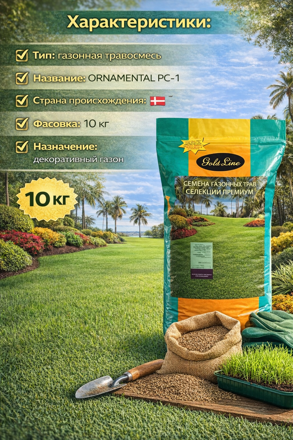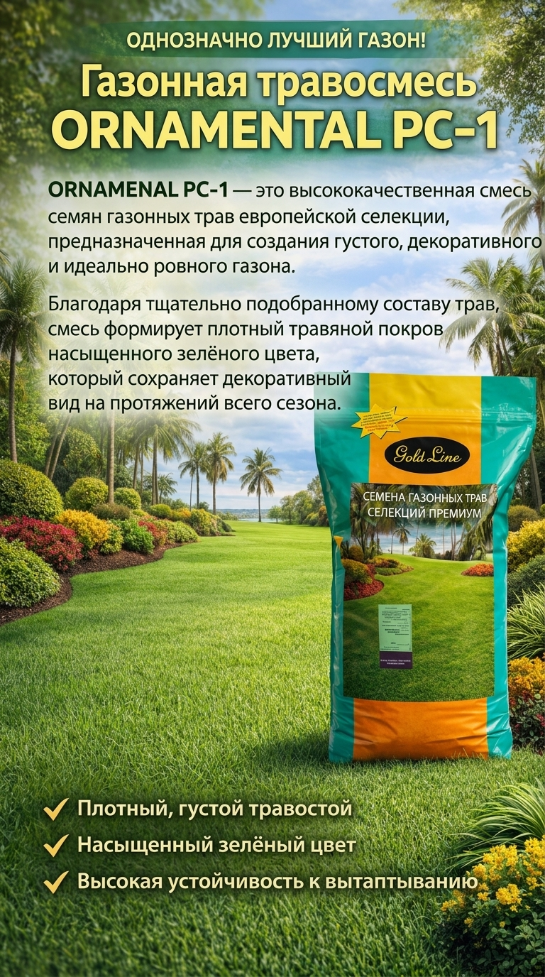 Газонная травосмесь ORNAMENTAL РС-1 — это высококачественная смесь семян газонных трав европейской селекции, предназначенная для создания густого, декоративного и идеально ровного газона. Благодаря тщательно подобранному составу трав смесь формирует плотный травяной покров насыщенного зелёного цвета, который сохраняет декоративный внешний вид на протяжении всего сезона.