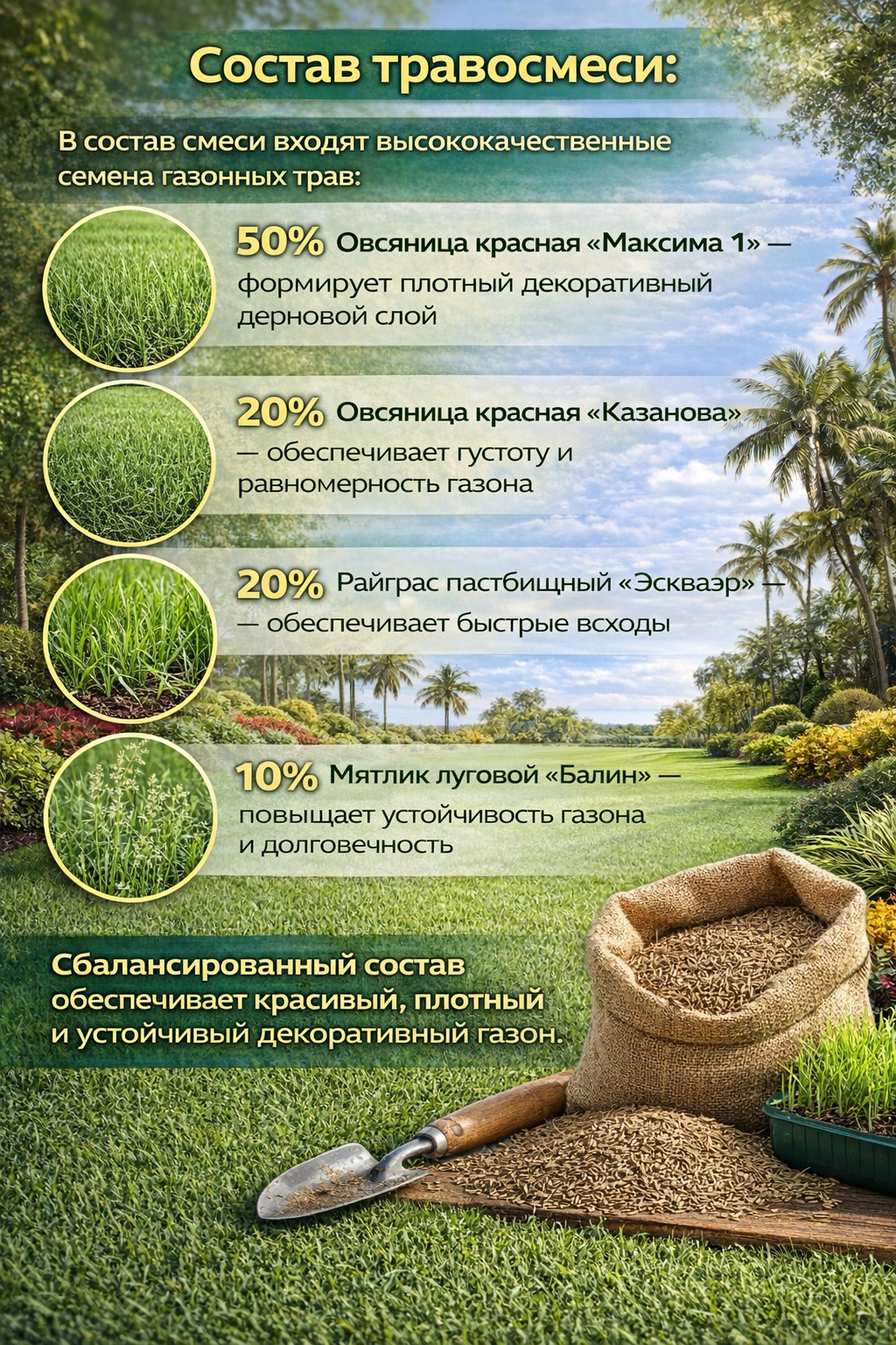 Травосмесь отлично подходит для ландшафтного дизайна, частных участков, парков, садов и декоративных территорий, где важны эстетика и аккуратный внешний вид газона.