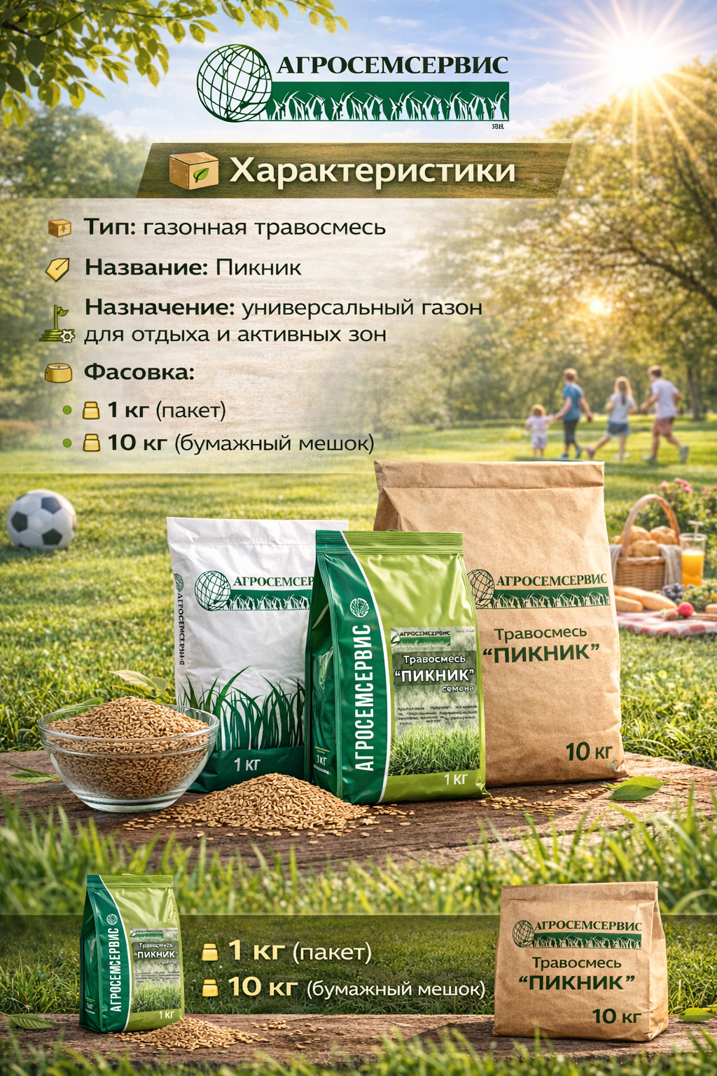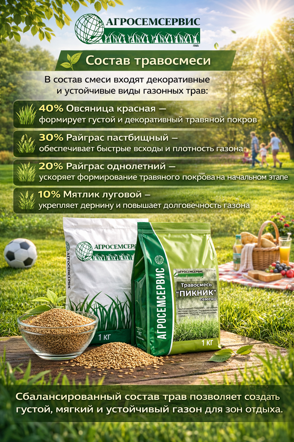 Газонная травосмесь «Пикник» — это специально подобранная смесь семян газонных трав, предназначенная для создания густого, мягкого и устойчивого газона. Смесь отлично подходит для участков, где газон используется для отдыха, прогулок и активного времяпрепровождения.