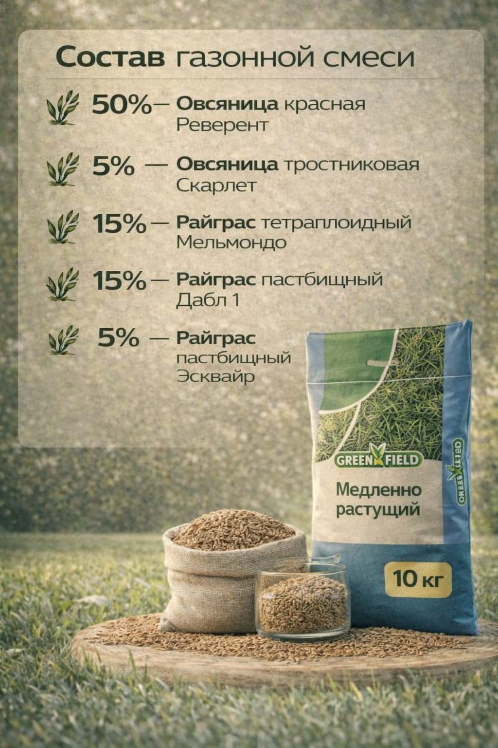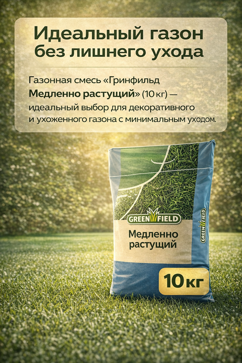 Газонная смесь «Гринфильд Медленно растущий» (10 кг) — идеальный выбор для декоративного и ухоженного газона с минимальным уходом. Смесь отличается медленным ростом, плотным травостоем и устойчивостью к неблагоприятным погодным условиям. Газон сохраняет насыщенный зелёный цвет длительное время и требует меньше стрижки. Упаковка 10 кг рассчитана на засев участка до 300 м².