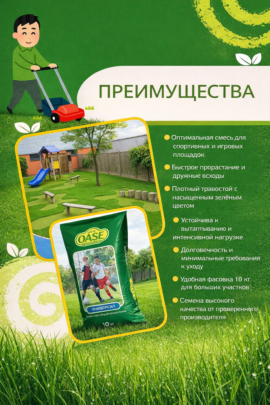Газонная смесь «Оазис Спортивный» (10 кг) — специально разработана для создания прочного и износостойкого газона на спортивных площадках, футбольных полях, детских и игровых зонах. Семена быстро всходят, образуют плотный травостой, устойчивый к нагрузкам и частому вытаптыванию. Газон сохраняет зелёный цвет весь сезон и легко переносит неблагоприятные погодные условия. Упаковка 10 кг рассчитана на засев до 300 м².