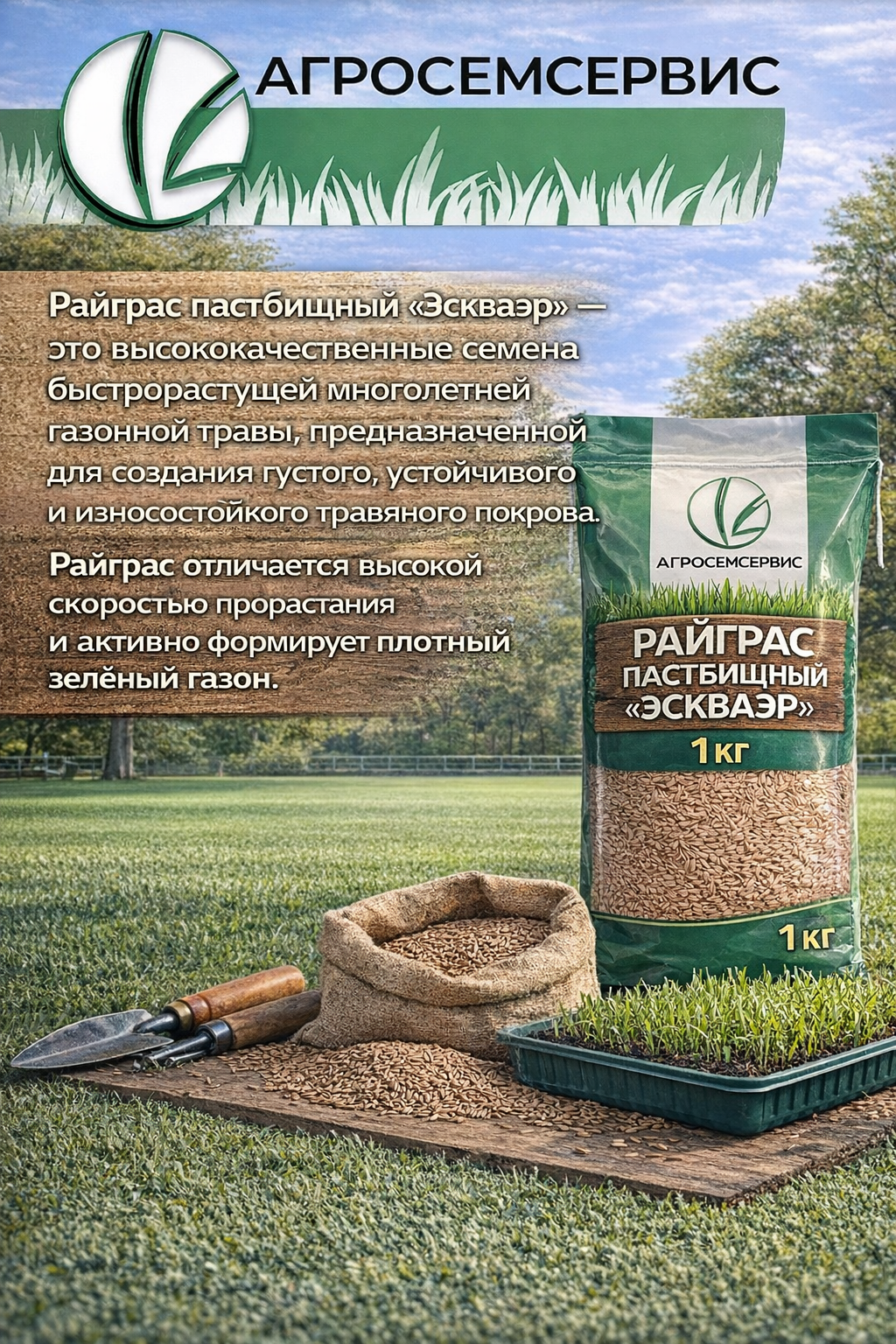 Райграс пастбищный «Эскваэр» — это высококачественные семена быстрорастущей многолетней газонной травы, предназначенной для создания густого, устойчивого и износостойкого травяного покрова. Райграс отличается высокой скоростью прорастания и активно формирует плотный зелёный газон.