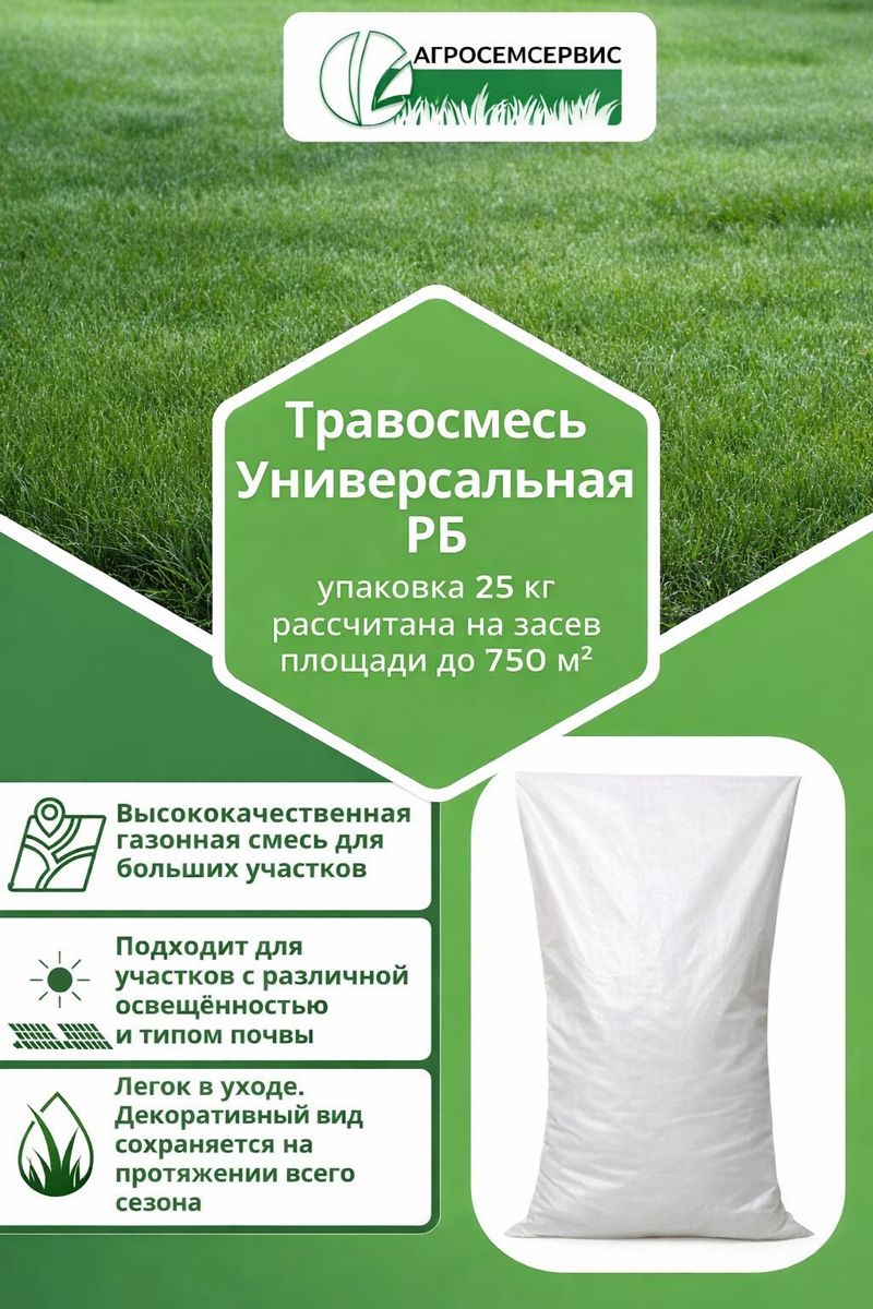 Травосмесь «Универсальная РБ» является практичным решением для создания декоративного и функционального газона, который сохраняет привлекательный внешний вид на протяжении всего сезона.