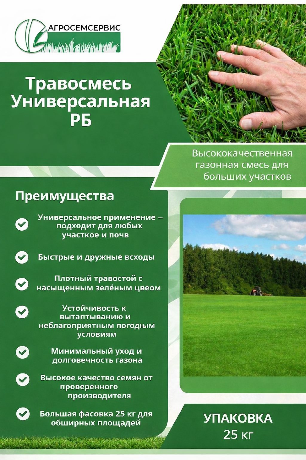 ЗАО «Агросемсервис» — компания с более чем 10-летним опытом работы на рынке семян газонных и кормовых трав. Компания предлагает широкий ассортимент качественных семян газонных трав и профессиональных травосмесей для создания декоративных, универсальных и спортивных газонов.